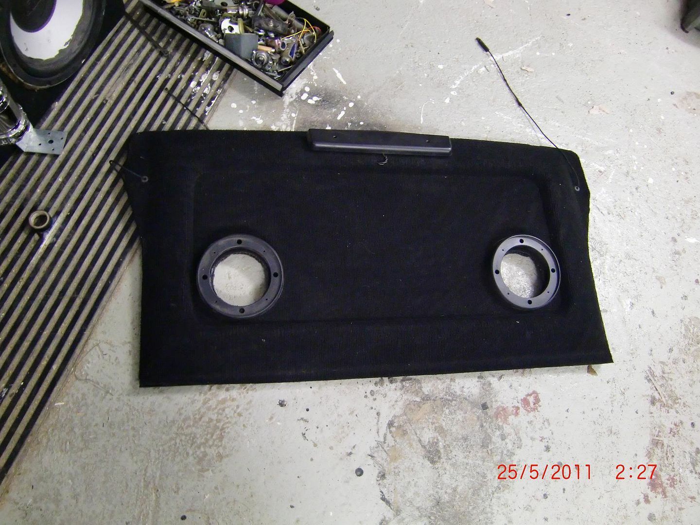 Ja kun joku joskus hattuhyllyyn on jo asentanut ilmeisesti 5,25" tuumaiset kaiuttimet niin tuli kairattua reiät 6,5" 3-tie satsille sopivaksi, Vectraan ostin nuo kolmitiet kolaripäivänä ja kerkesin niitä soitattaa pari tuntia ennen tälliä, ovat omiaan tuonne Kadetin hattuhyllylle