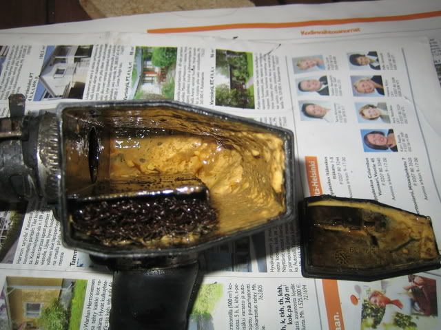 Mun "loota" ei ollut ilmeisesti kokenut puhdistusta sitten ensiasennuksen. Jos kesän jäljiltä voi mokoma olla noin täynnä veden ja öljyn sekoitusta, niin en uskalla edes ajatella kuinka täynnä se on talvella. Hetken jo koputtelin puuta, ettei vaan kansipahvi ole mennyt. Pitää tässä seurailla tilannetta.