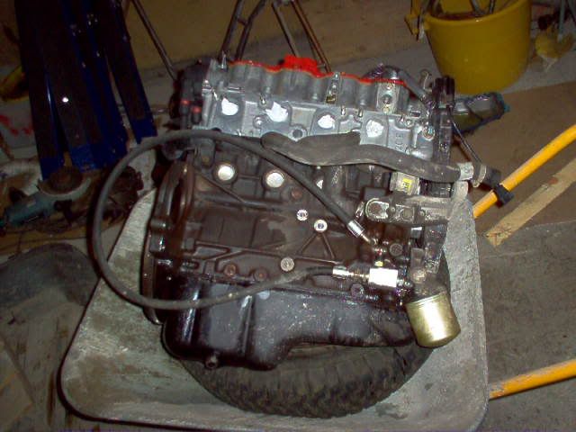 Turbo kone kottikärryissä odottamassa ruumiin avausta,kuvassa näkyy "jakotukki" josta haaroitettu turbolle öljy:
