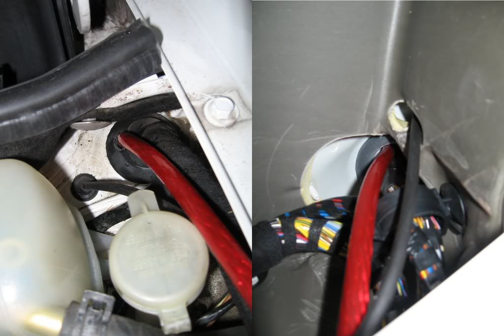 Ei ole valitettavasti kuvaa läpiviennistä. Et voi kyllä missata sitä. Polkimien yläpuolelta verhouslevy irti niin siellä näkyy varmaan 6cm halkaisijaltaan oleva kumilurtsukka, josta menee paksu kaapelinippu läpi. Siinä on ehkä sentin verran ohutta kumia kaapelinipun ympärillä, josta menee ohut meisseli tms helposti läpi. Moottoritilan puolelta katsottuna läpivienti on siellä jarrutehostimen ja paisuntasäiliön alla katseelta sekä kädeltä melko hyvin piilossa.