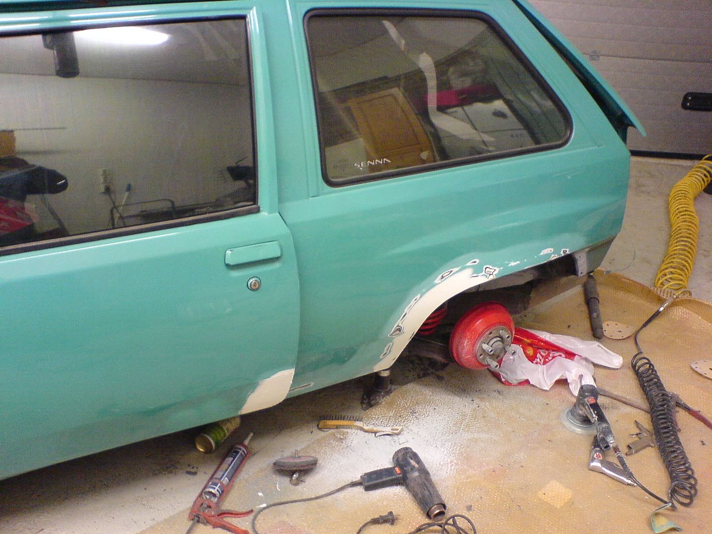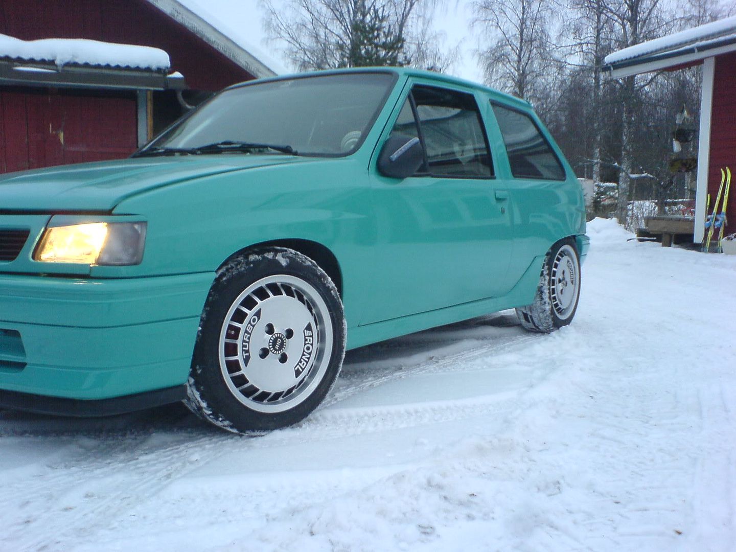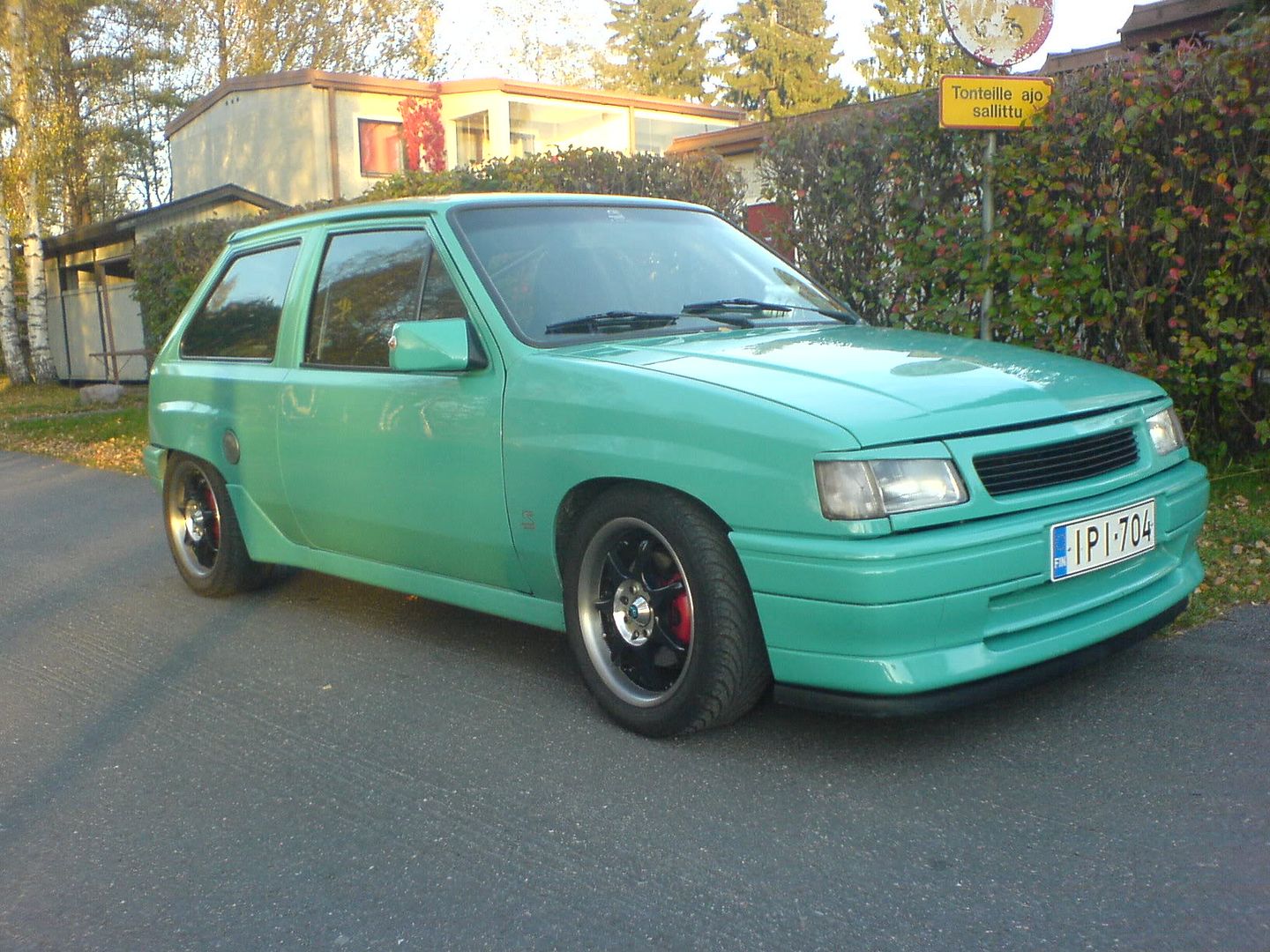 ja tolta sitten myöhemmin kesällä ku laitoin siihen jouset(koska saksalainen oli rälläkällä madaltanu sen)ja vaihdoin vanteet koska ei ollu toivoa saada leimaa noilla 14x8" http://i40.photobucket.com/albums/e235/ ... 294b80.jpg